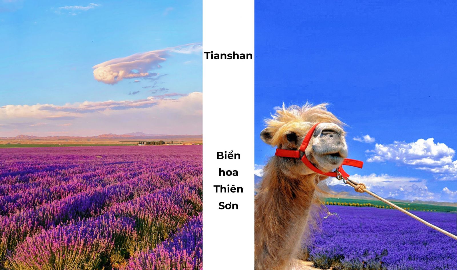 - Biển hoa Thiên Sơn - nằm dưới chân dãy núi Thiên Sơn (Tianshan) tại Tân Cương, đây là khu thắng cảnh kết hợp giữa cảnh quan thiên nhiên và các thảm hoa rực rỡ. Vào mùa hoa nở, những cánh đồng hoa trải dài bất tận, nổi bật trên nền núi tuyết, thảo nguyên và bầu trời xanh, tạo nên khung cảnh rộng lớn, đầy màu sắc và đậm nét đặc trưng của vùng Thiên Sơn.