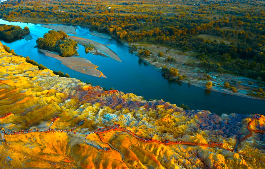 - Vịnh Ngũ Sắc với các khối đá sắc màu rực rỡ, được hình thành qua hàng triệu năm bởi sự xói mòn của gió và nước. Vịnh Ngũ Sắc được mệnh danh là "địa hình Yadan đẹp nhất Tân Cương" thuộc danh sách "Top 100 cảnh đẹp Tây Bắc" vào năm 2018, đây là danh lam thắng cảnh cấp quốc gia 4A nằm cạnh dòng sông Irtysh.