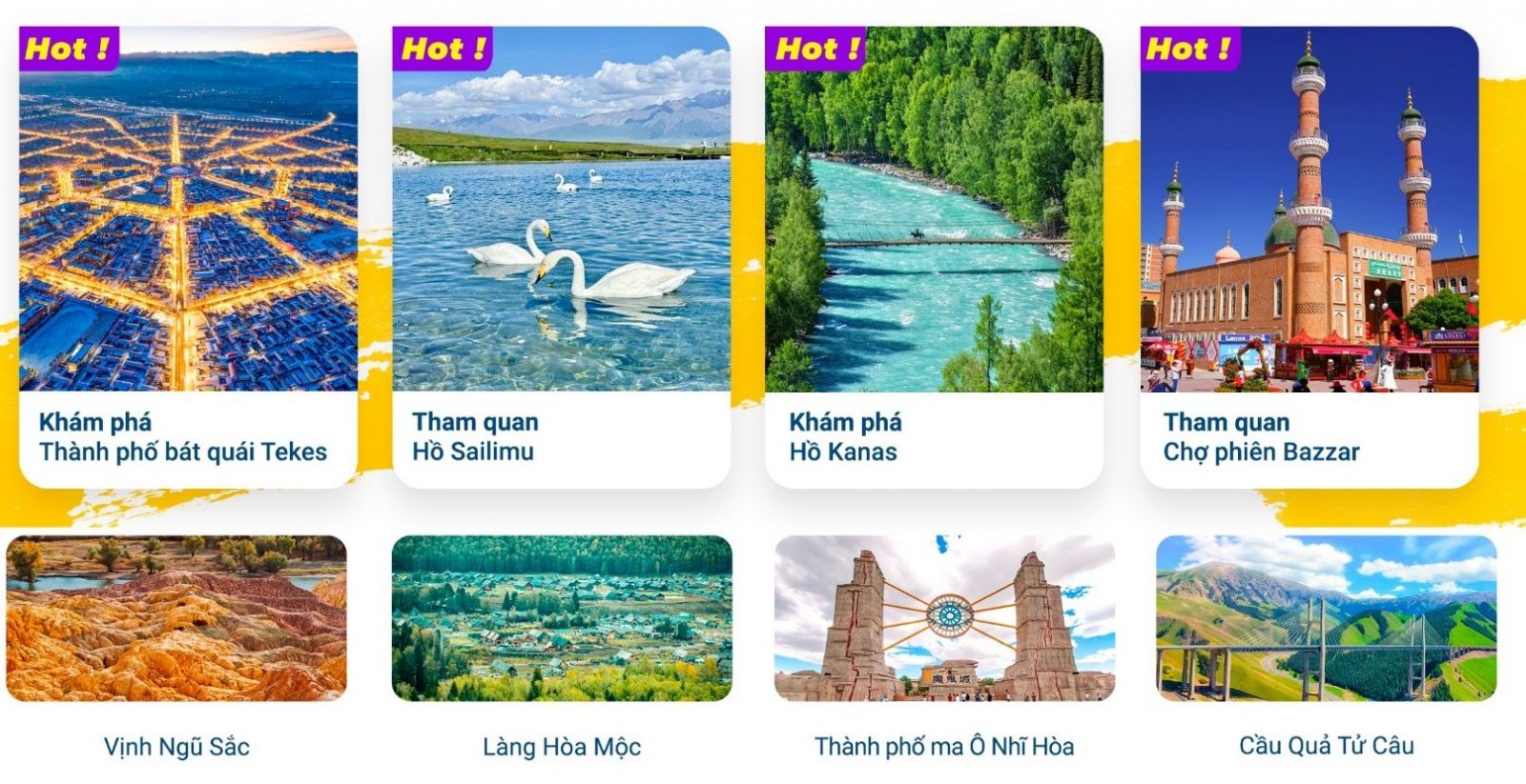 - Làng Hemu - làng Hòa Mộc (bao gồm xe trung chuyển), ngôi làng nhỏ xinh đẹp được bao bọc trong dãy núi Altay trùng điệp của vùng bắc Tân Cương, hoàn toàn tách biệt với cuộc sống bên ngoài. Nơi đây được mệnh danh là ngôi làng số 01 Trung Quốc, là nơi tập trung sinh sống của cộng đồng người Kazhastan và người Tuva.