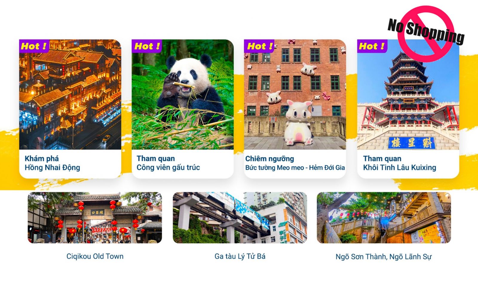 - Option 2: Lẩu Waizui Trùng Khánh và Dạo Xe Trên Giao Lộ Tô Gia Bá – một phần giao thông ma trận, ngắm cảnh đêm tại Vân Đoan Chi Nhãn Hồng Nhai Động nhộn nhịp về đêm. (Chi phí tự túc).